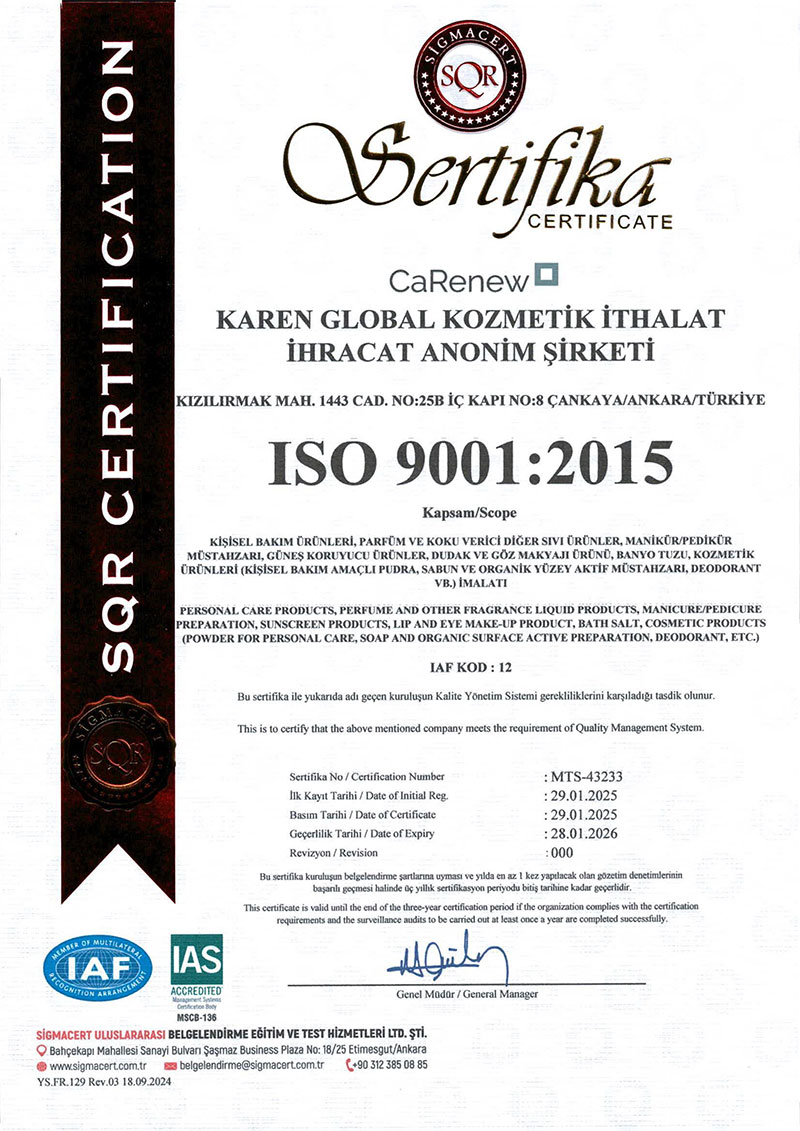 AB Akreditasyonu: Karen Global Kozmetik A.Ş., ürünlerini AB standartlarına uygun olarak üretmektedir. Bu akreditasyon, güvenli ve etkili güzellik ürünleri üretme konusundaki kararlılığımızı vurgular.